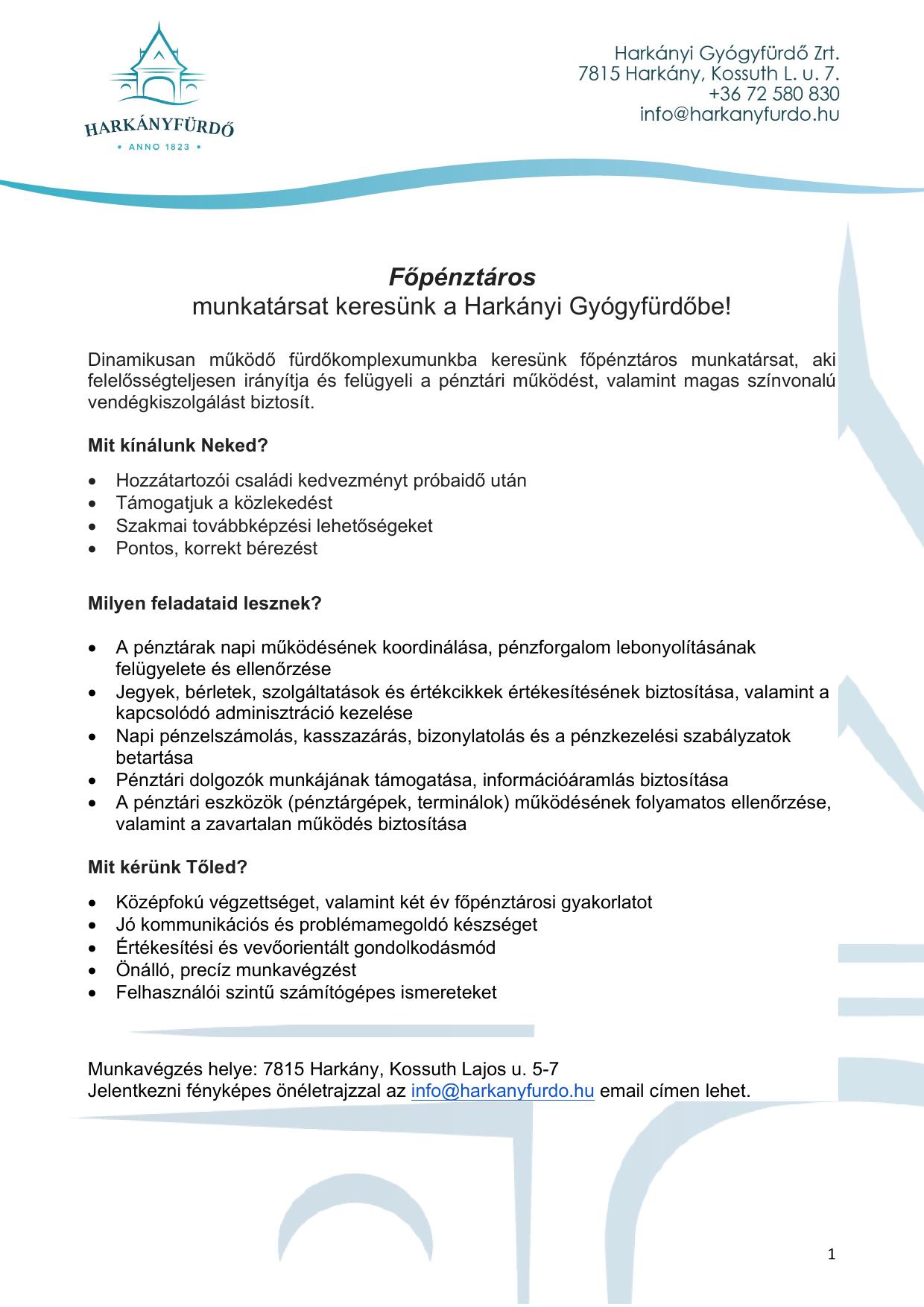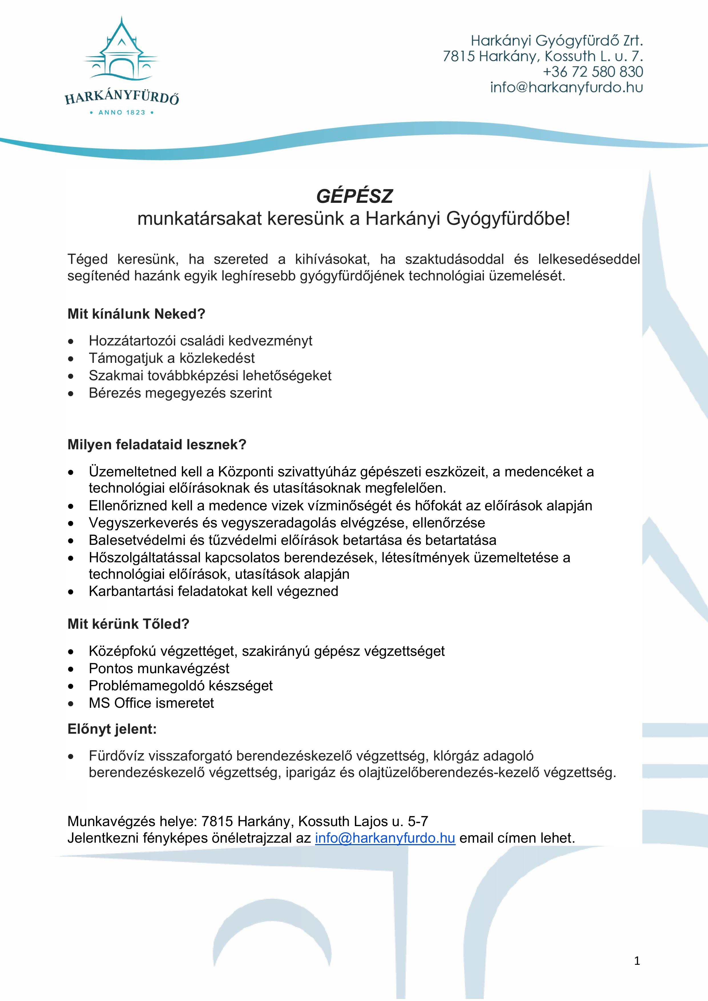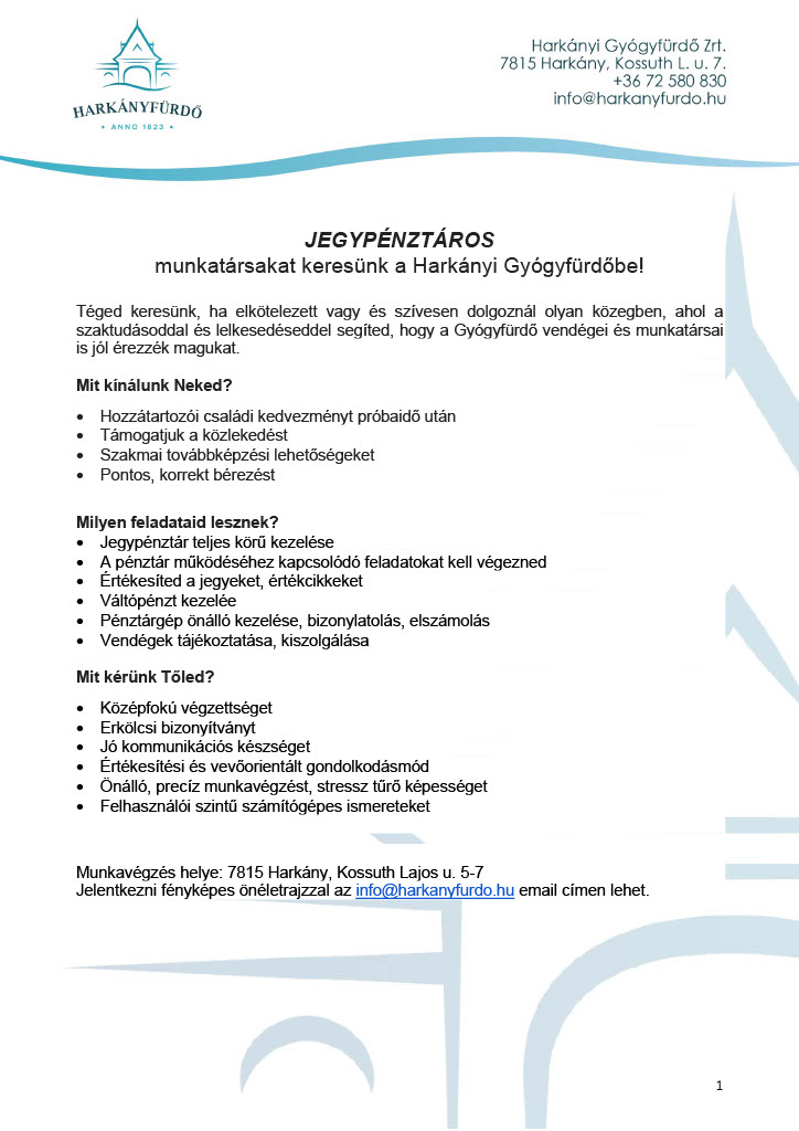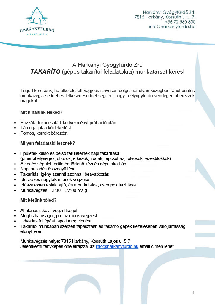 Hagyományainkat folytató és a fürdőkultúra fejlesztésében érdekelt kollégák felvételével kívánjuk erősíteni a Harkányi Gyógy- és Strandfürdőt.